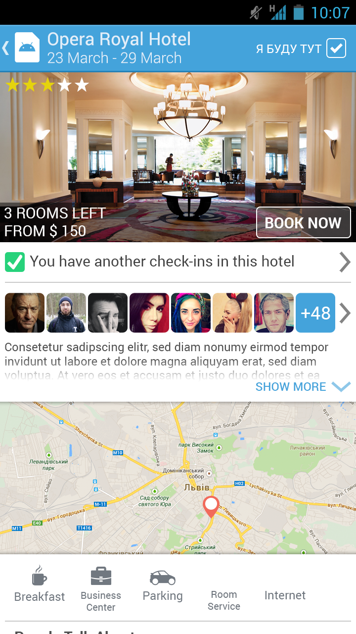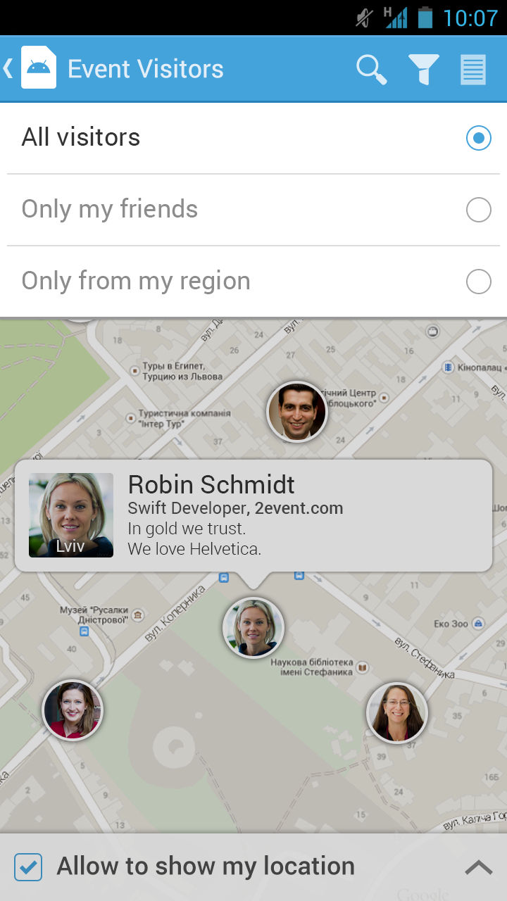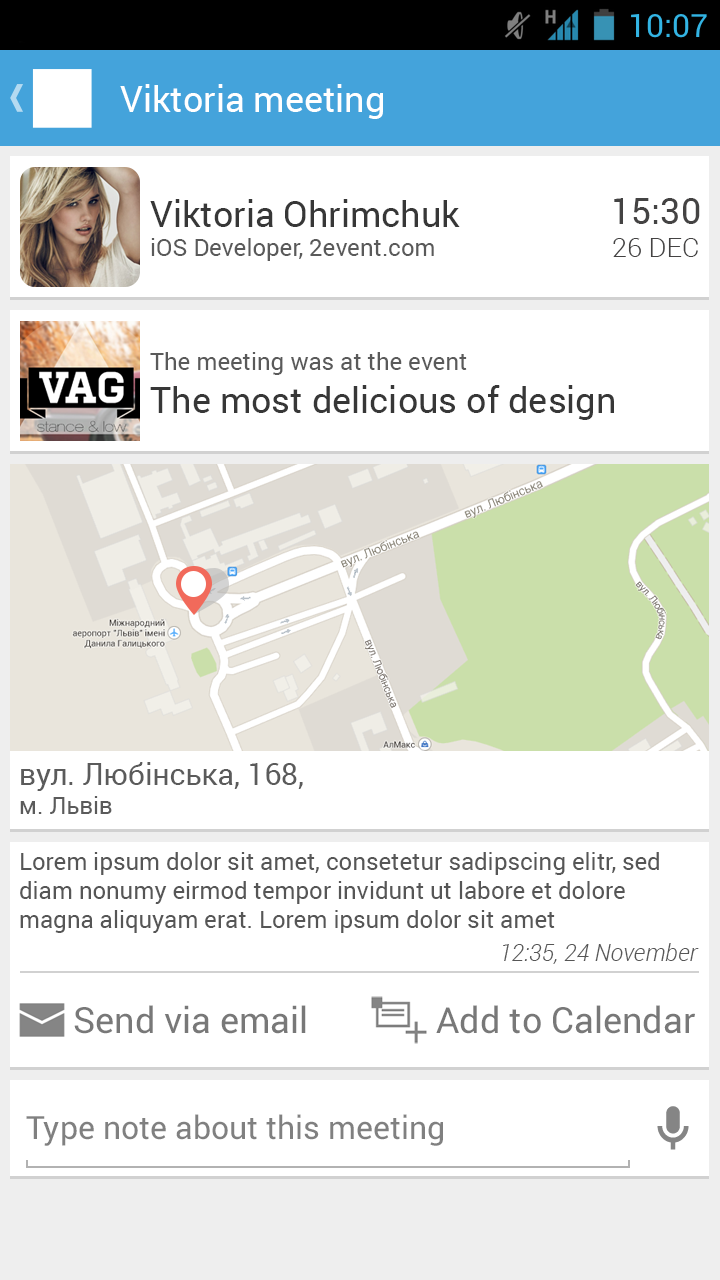In the end of the event You’ll have not a pack of paper cards and the question :"Who are these people and what are we talk about?" But detailed information about each participant and notes about the meeting in your smartphone.